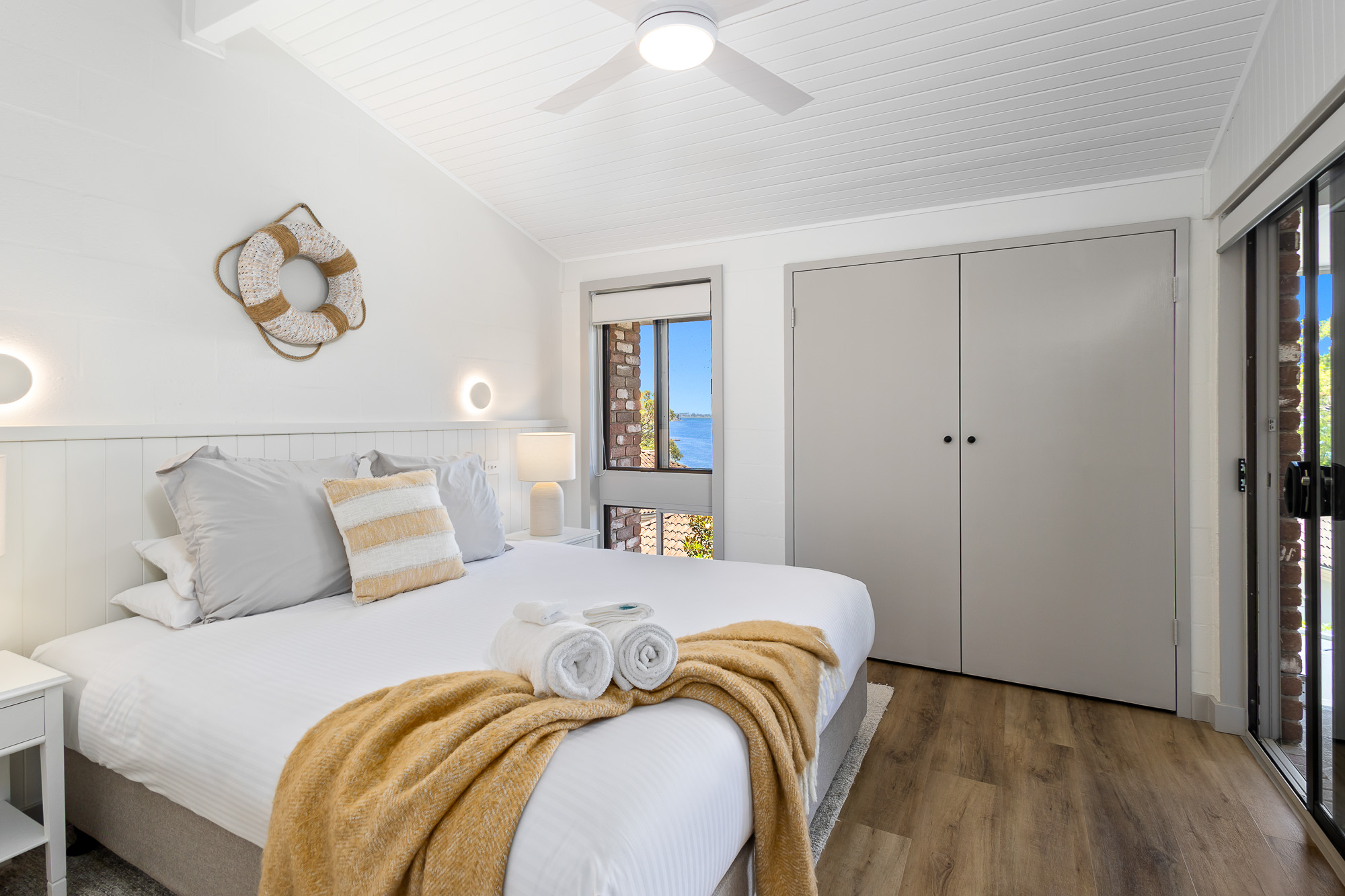 Located across two levels, with access from the carpark or via a shared balcony, our queen bed motel rooms features a lounge /dining, kitchenette, private en-suite bathroom with shower, and shared balconies or patios with water views from outdoor setting.